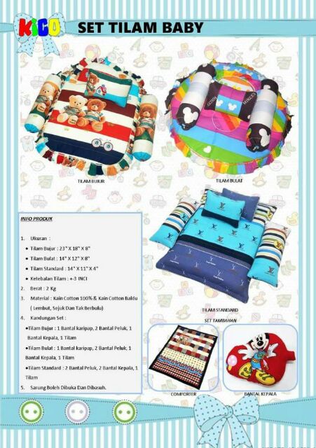 Bagi anak-anak dan orang dewasa tidur menggunakan bantal adalah hal yang biasa dilakukan. Di Little Baby Bear kami membuat set tilam me n gikut saiz sama seperti di pasaran walaupun set tilam di sini boleh di tempah mengikut saiz pilihan pelanggan tetapi bagi memudahkan pelanggan set tilam bersaiz biasa lebih murah dan padat berbanding di luar sana.